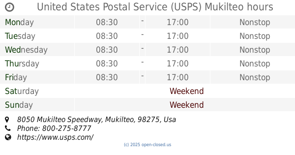 Please note that the information for United States Postal Service (USPS) In Mukilteo, 8050 Mukilteo Speedway and all other Branches is for reference only.
